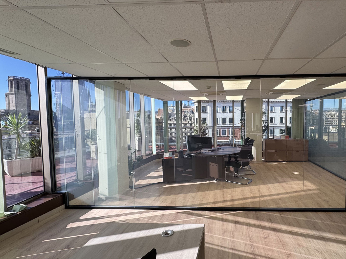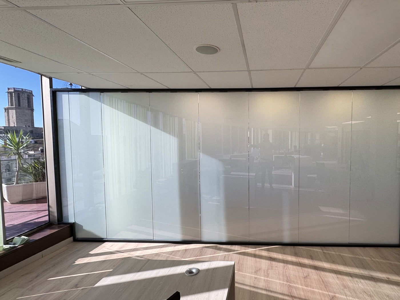 Instalación de lámina PDLC en despacho con vistas de Barcelona